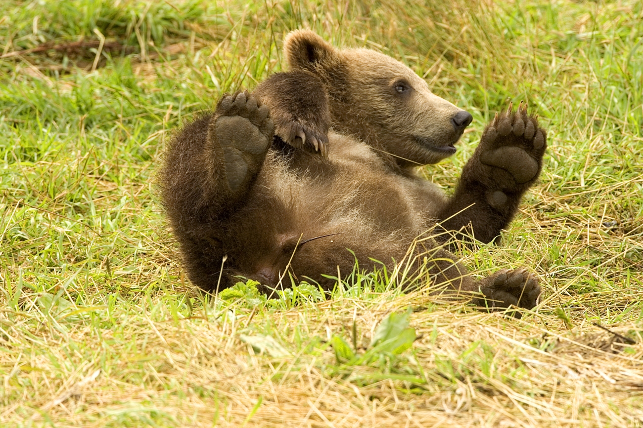 Brown bear cub playing in the grass