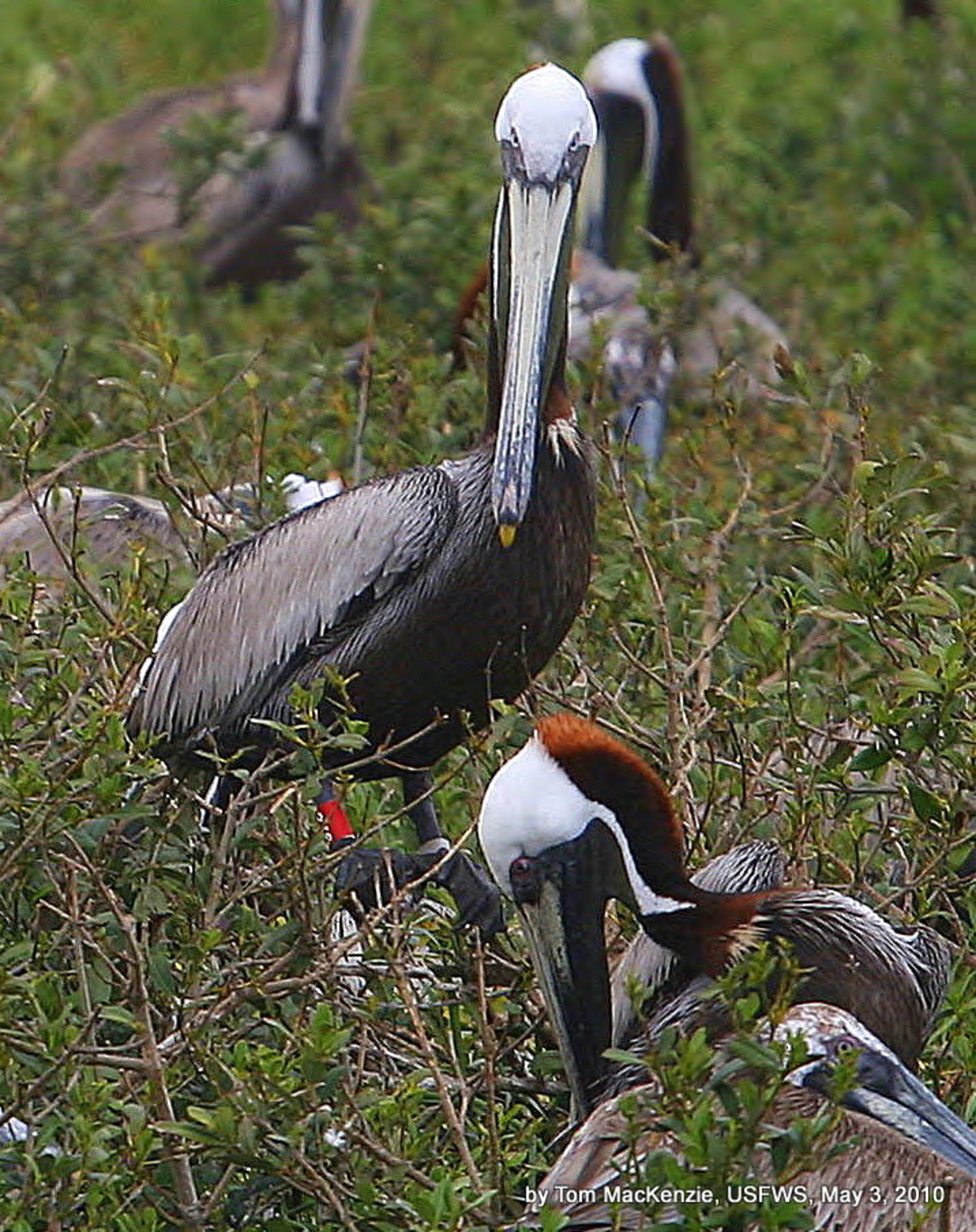 Banded brown pelican at Breton National Wildlife Refuge after booms placed to prepare for possible oil impact from the Deepwater Horizon spill.