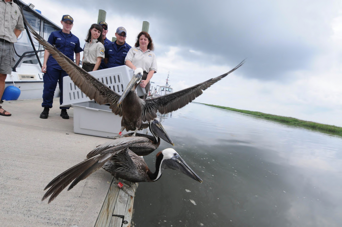 Brown Pelicans being released into wild by USFWS personnel. Image taken fromUSFWS Pacific Southwest Region Flickr page