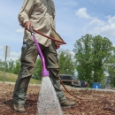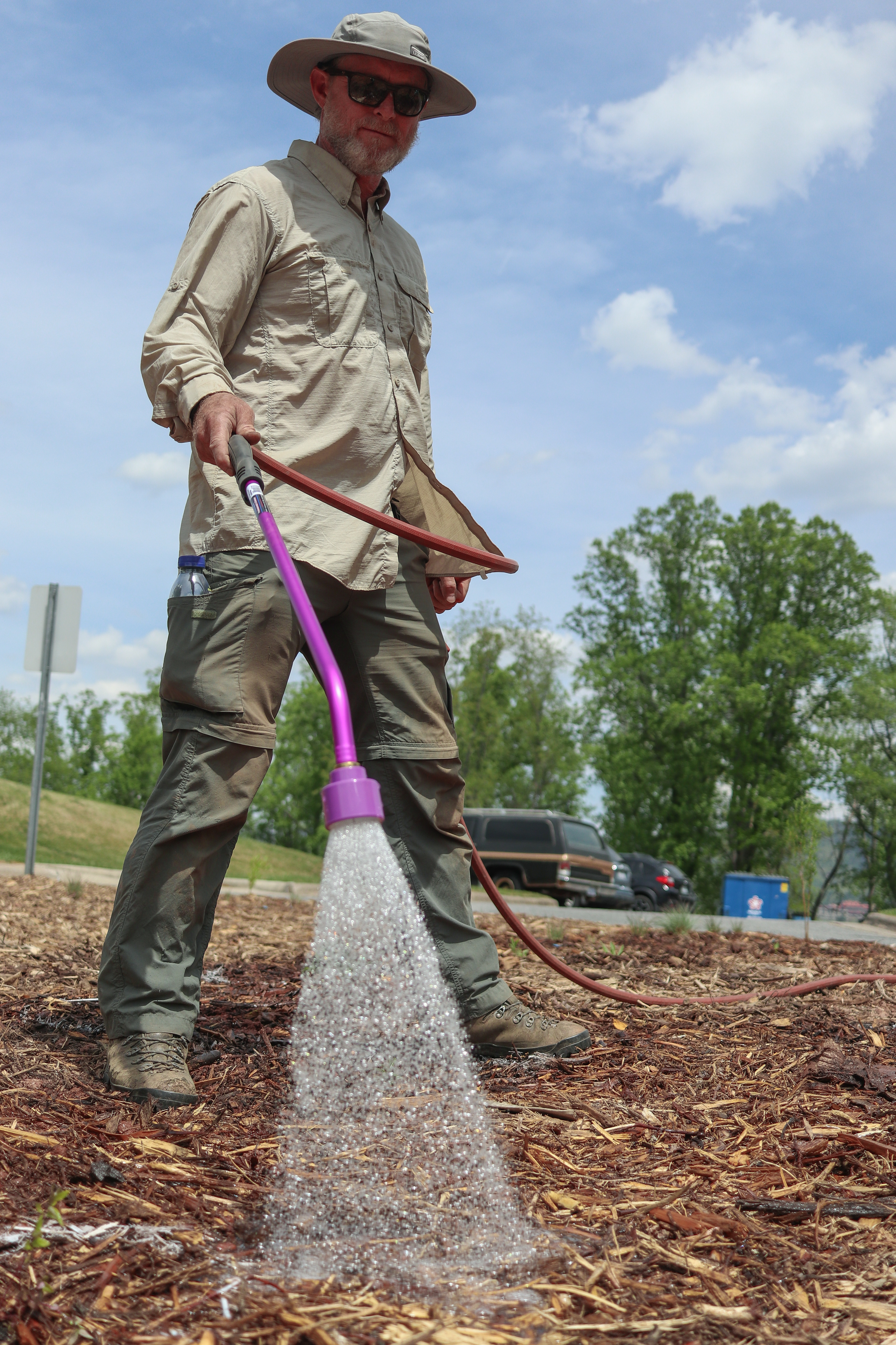 Bryan Tompkins, U.S. Fish and Wildlife Service, watering newly planted plants at the Klondyke Community pollinator garden. Buncombe County, NC.