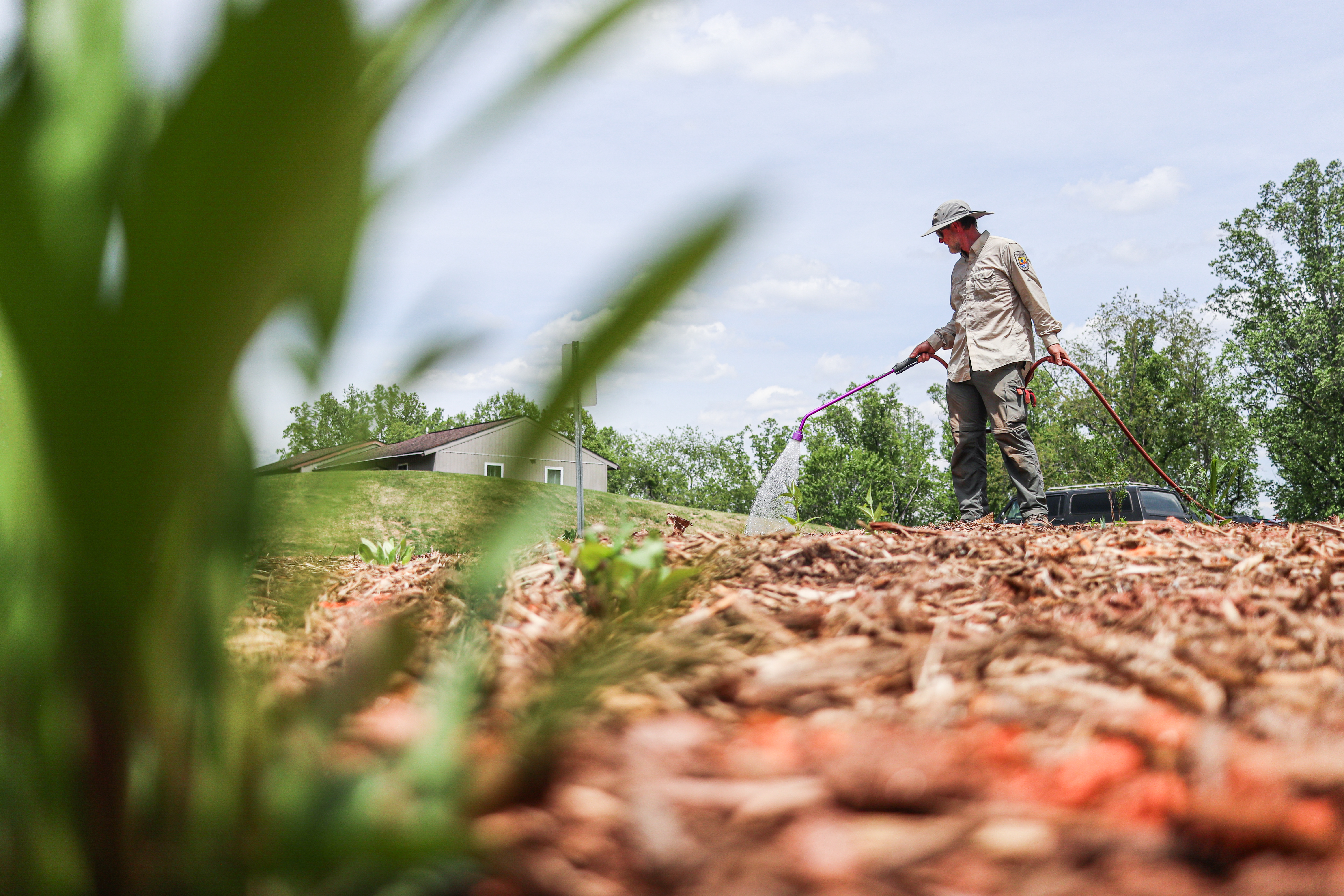 Asheville Field Office biologist Bryan Tompkins waters recently installed plants at the Klondyke Community garden, Asheville, North Carolina.