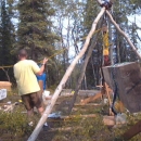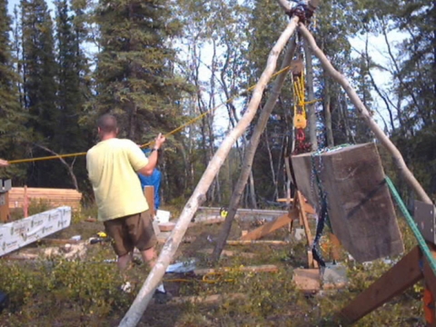 Building a cabin in sub-arctic Alaska. The cabin foundation is put into place with a block and tackle in the interior of Alaska. The usual mode of transportation to these off-road system structures is snowmobile, or, more commonly called, snow machine.
