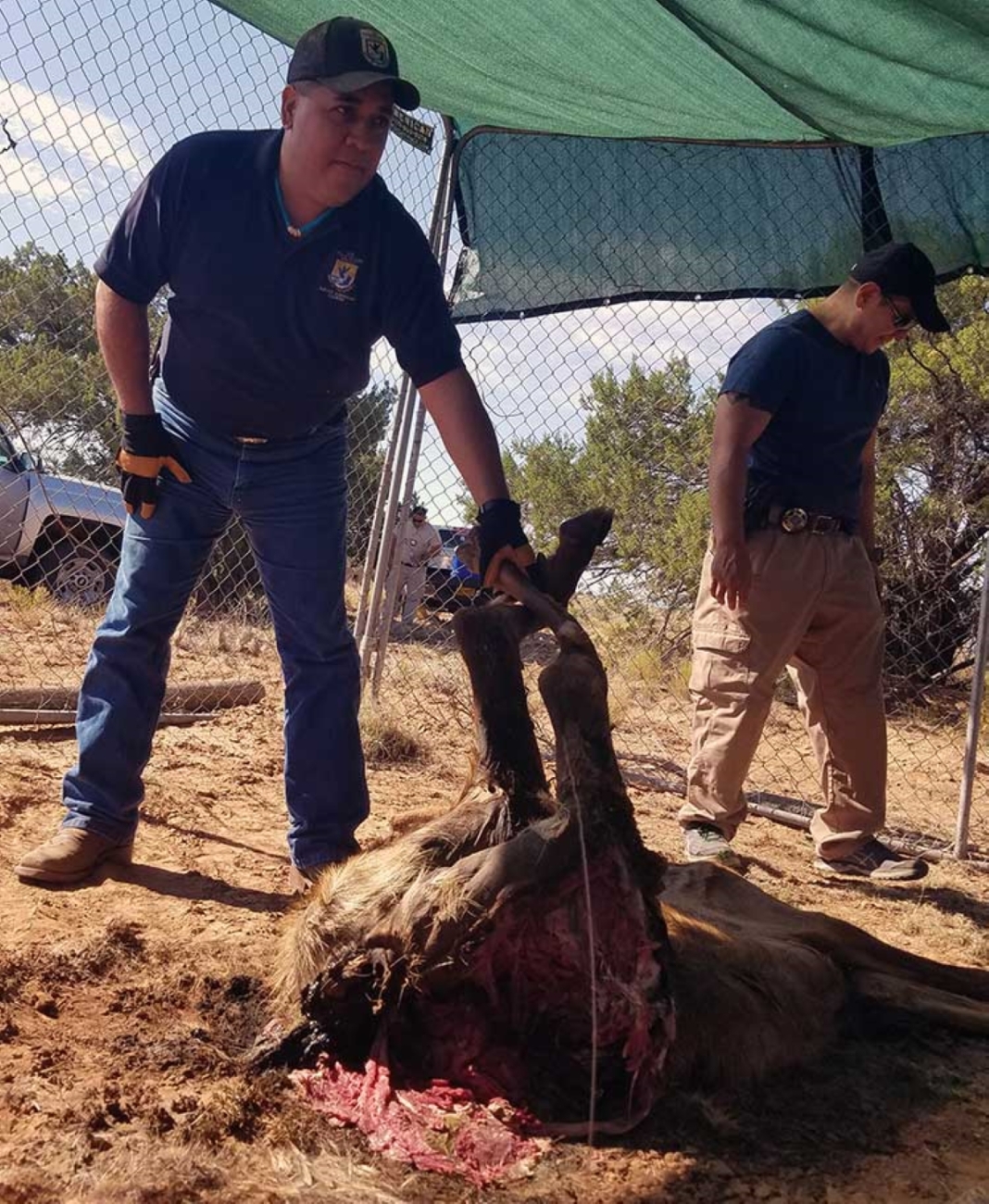 U.S. Fish and Wildlife Service Southwest Region Native American Liason Joseph Early lifts up the hind quarters of a decaying bull elk, exposing the still moist meat that’s preferred by blowfly larvae. The bull elk was collected from roadkill by a government agency, then kept in a walk-in freezer in preparation for the training, then put at the training site two weeks before the class began.