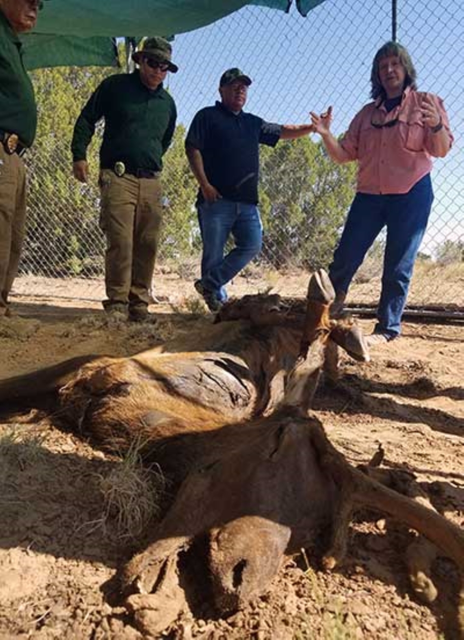 Founder/Director of government contractor Wildlife Field Forensics and former Federal Wildlife Officer Carleen Gonder (right) instructs tribal game officers on determining time of death by examining decomposition stages. She does this by examining a decaying bull elk carcass. The bull elk was collected from roadkill by a government agency, then kept in a walk-in freezer in preparation for the training, then put at the training site two weeks before the class began.