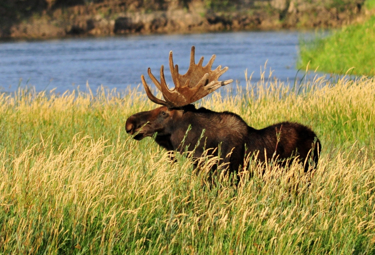Bull moose eating Coyote Willow on Seedskadee National Wildlife Refuge. By late August, this bull moose (Shiras) antlers are nearly full grown. The blood supply to the antlers will slow and eventually stop, causing the antlers to harden into bone like material. The velvet covering the antlers will then be rubbed off by the bull. This bull was feeding on Coyote willow along the banks of the Green River. The word "moose" is derived from the native North American Algonquian Indian word meaning "twig eater".