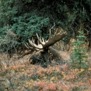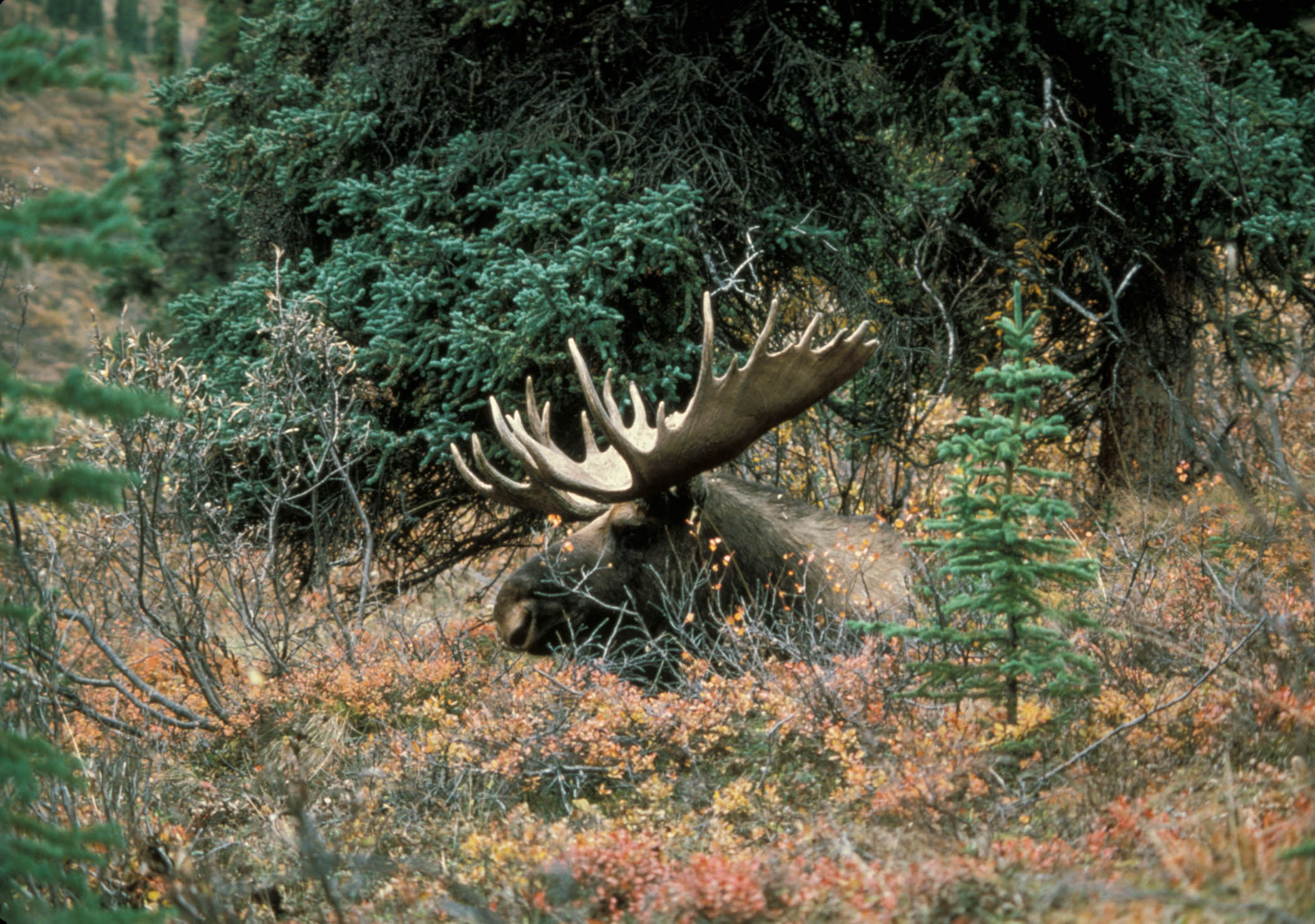 Bull moose rests in vegetation