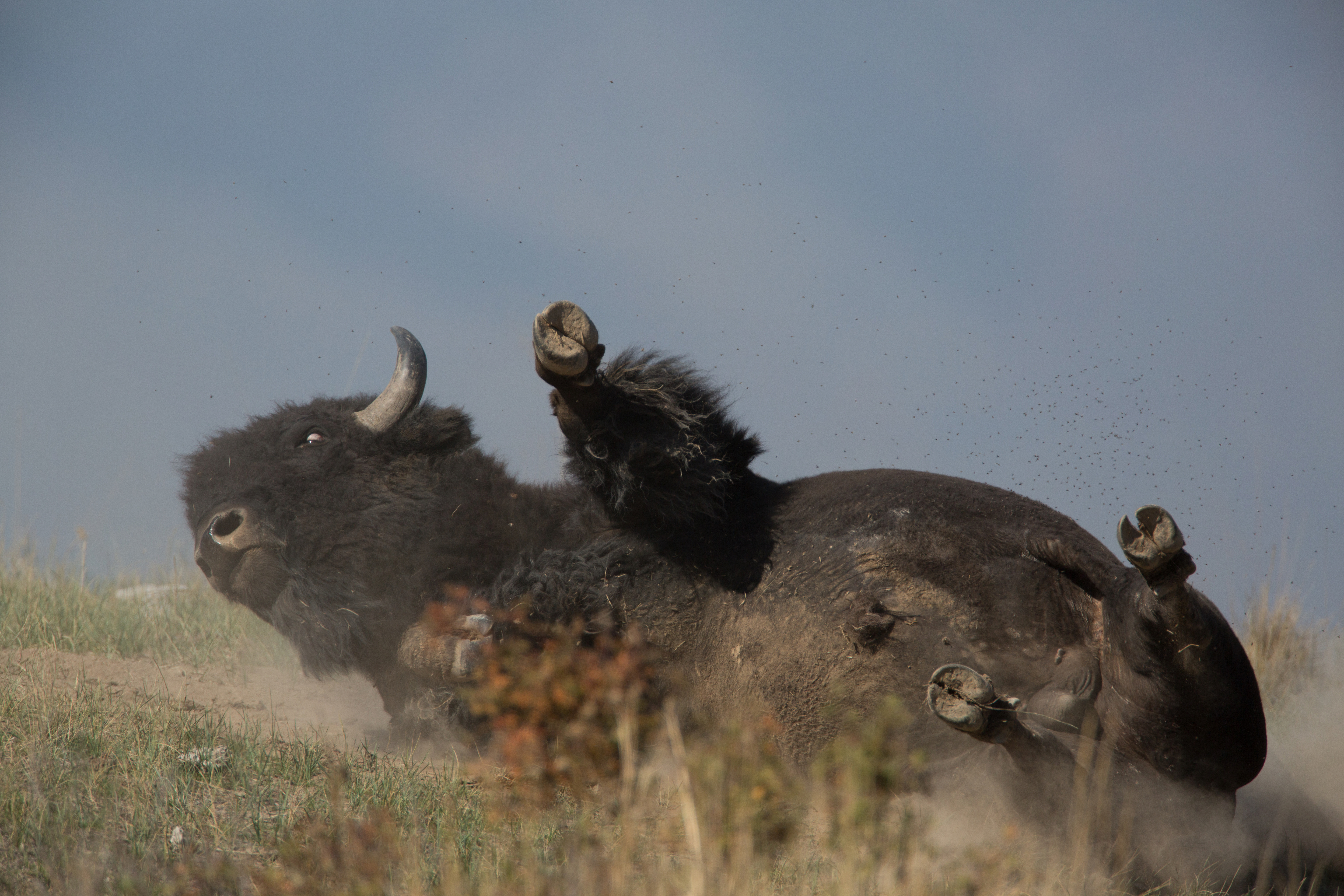 Close-up of a Bison bull rolling in the dust in the prairie.