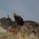 Bull rolls in dust