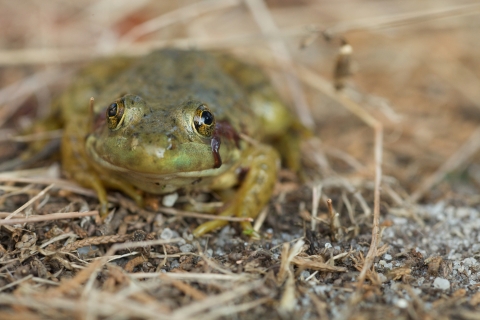 A bullfrog is facing foreward in a grassy area at Edwin B. Forsythe National Wildlife Refuge in New Jersey.