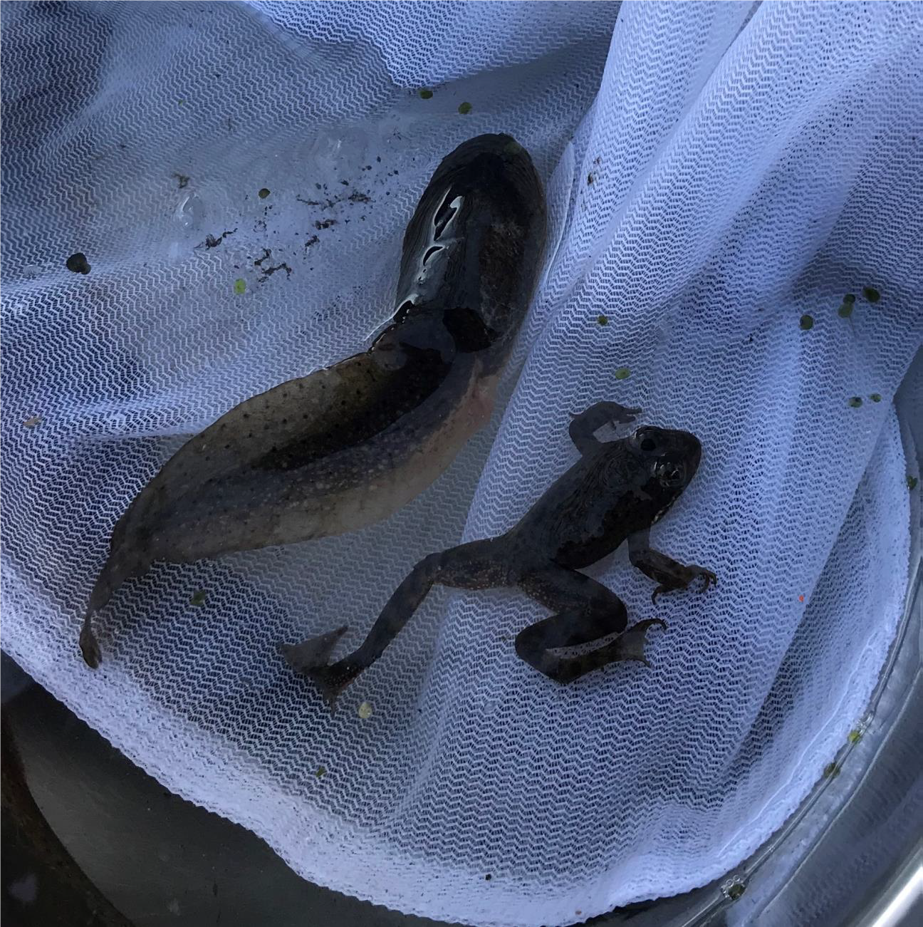 Even as a tadpole, the American bullfrog dwarfs the Oregon spotted frog.