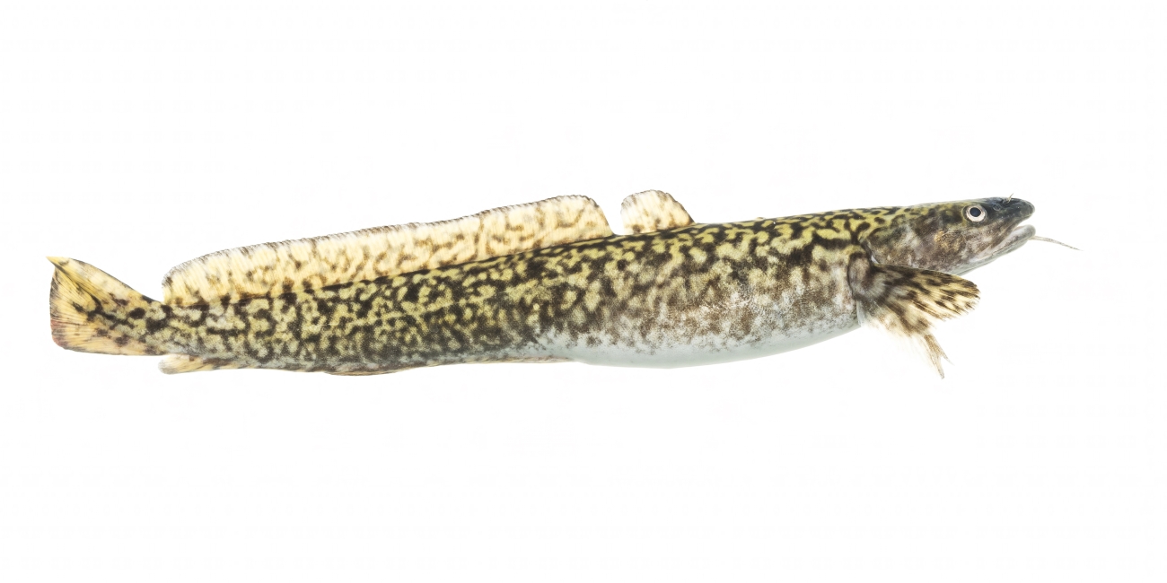 Burbot have mottled skin that ranges in color from black to grey to olive and even yellow. They have elongated dorsal and anal fins that extend all the way to a rounded caudal fin and a distinct single soft barb on their lower jaw.