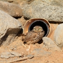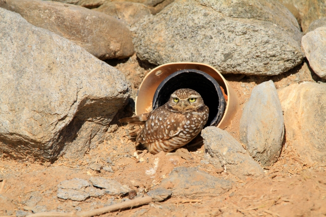 Burrowing owls are small, sandy colored owls with bright yellow eyes. They live undergorund in burrows in habitats like grasslands and deserts.