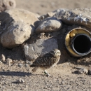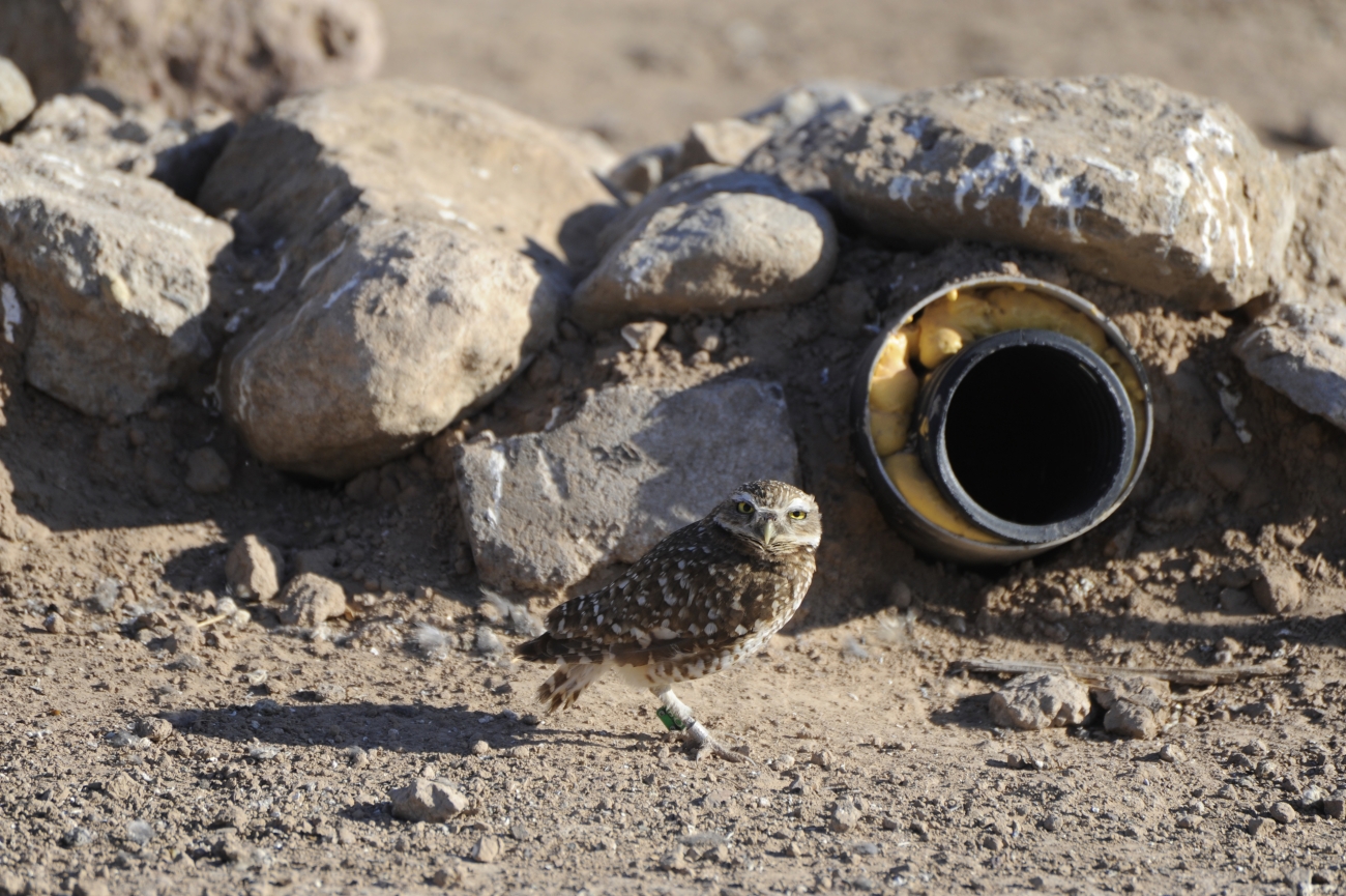 A burrowing owl stands outside of an artificial burrow. Cibola National Wildlife Refuge has constructed artificial homes for the birds.