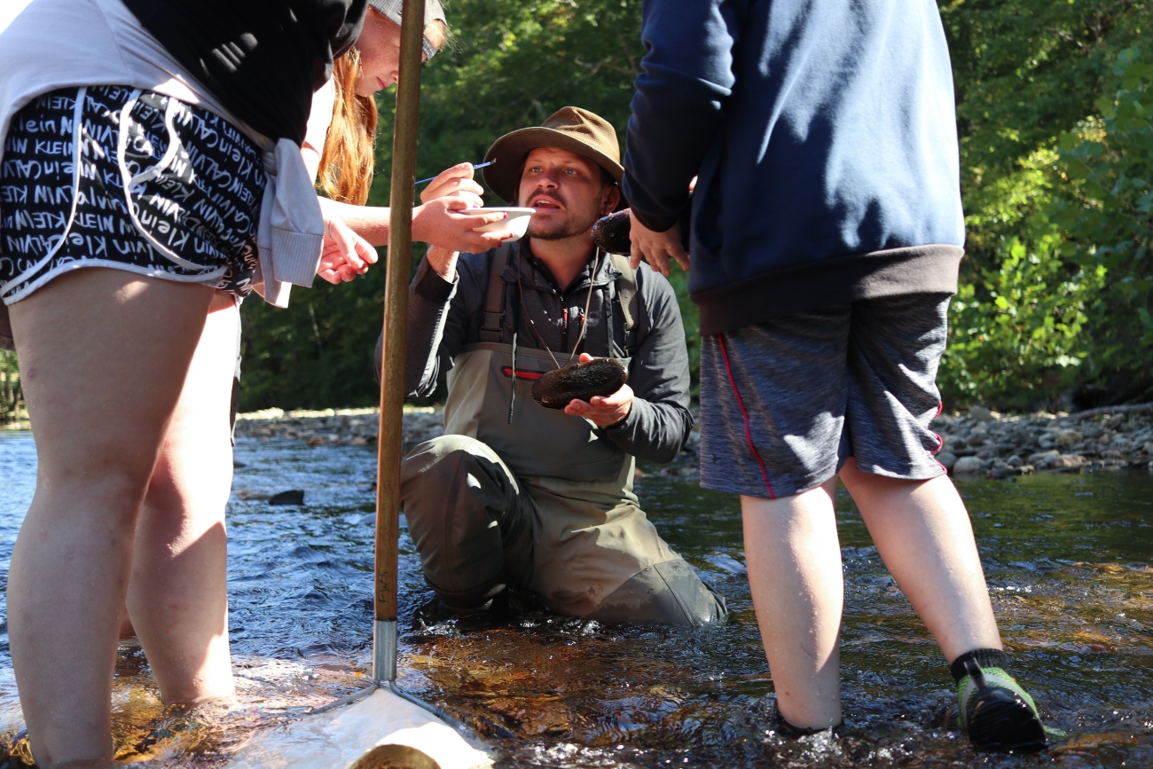 Service biologist Byron Hamstead examines a stream insect pulled from a stream bottom rock before placing it in a student's collection bowl.