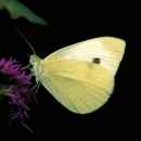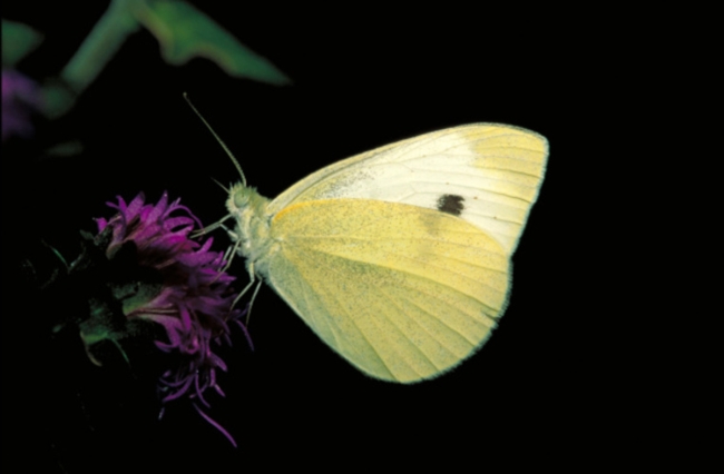 Light yellow and white butterfly with light brown spot on wing, sitting on purple bloom, viewed from the side with wings upright.