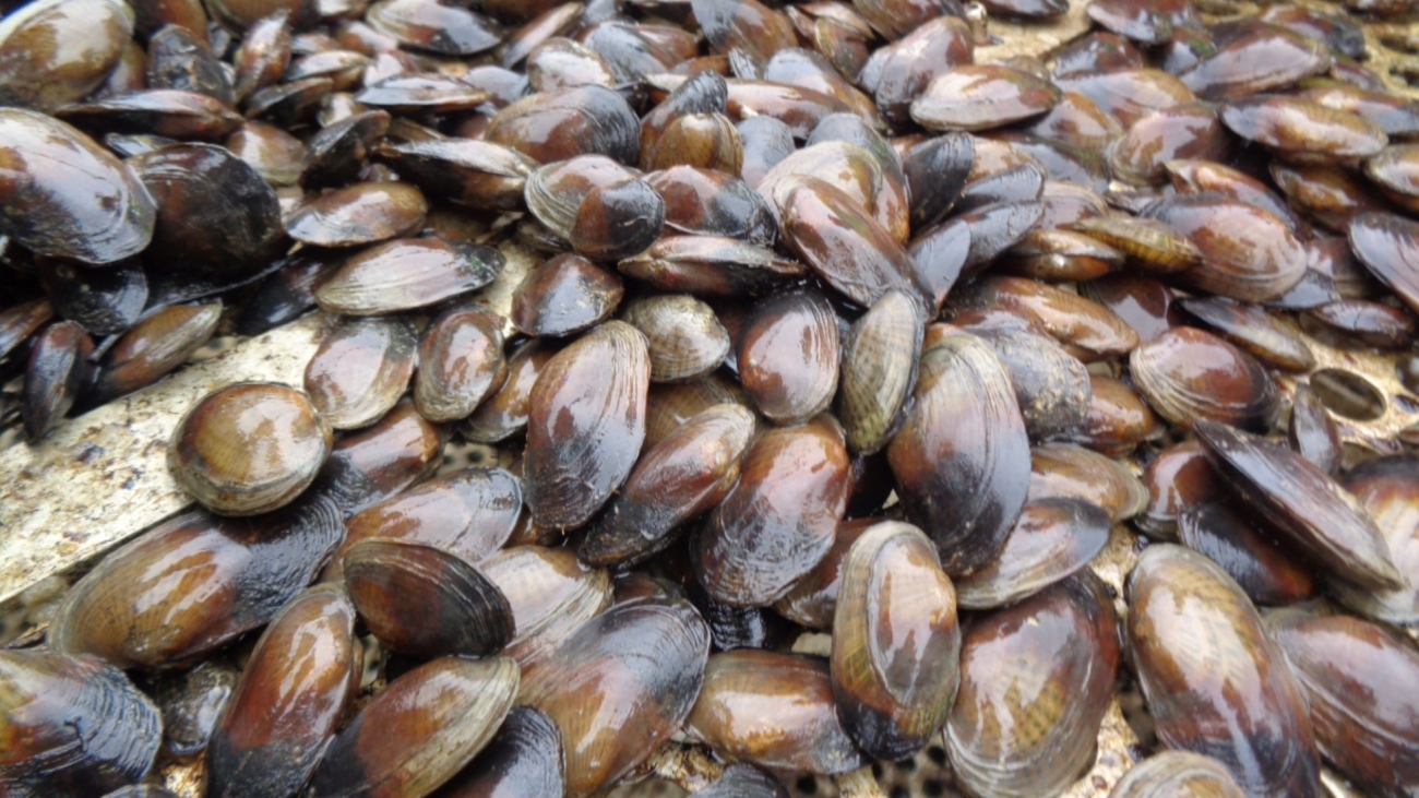 Juvenile speckled pocketbook mussels produced using a cage culture method in a lake environment.