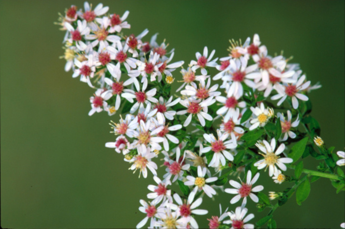 Close up of many white flowers with red centers on a stem. For more information about wildflowers visit the National Plants Database Additional Resources: National Plants Database http://plants.usda.gov/.