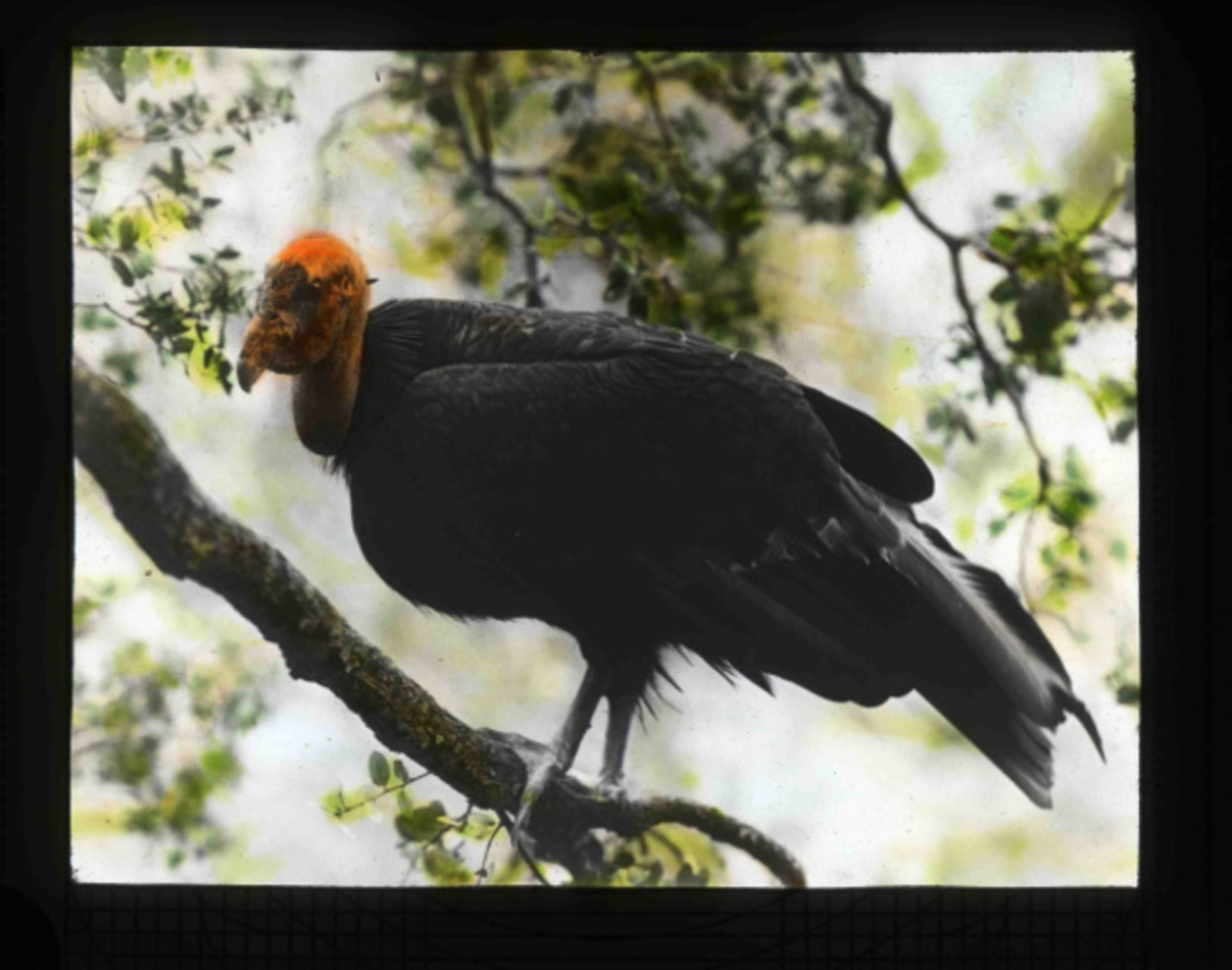 A hand painted glass slide of a condor perching near its nest site in Los Angeles. Taken by Finley and Bohlman as part of their 1906 condor series.