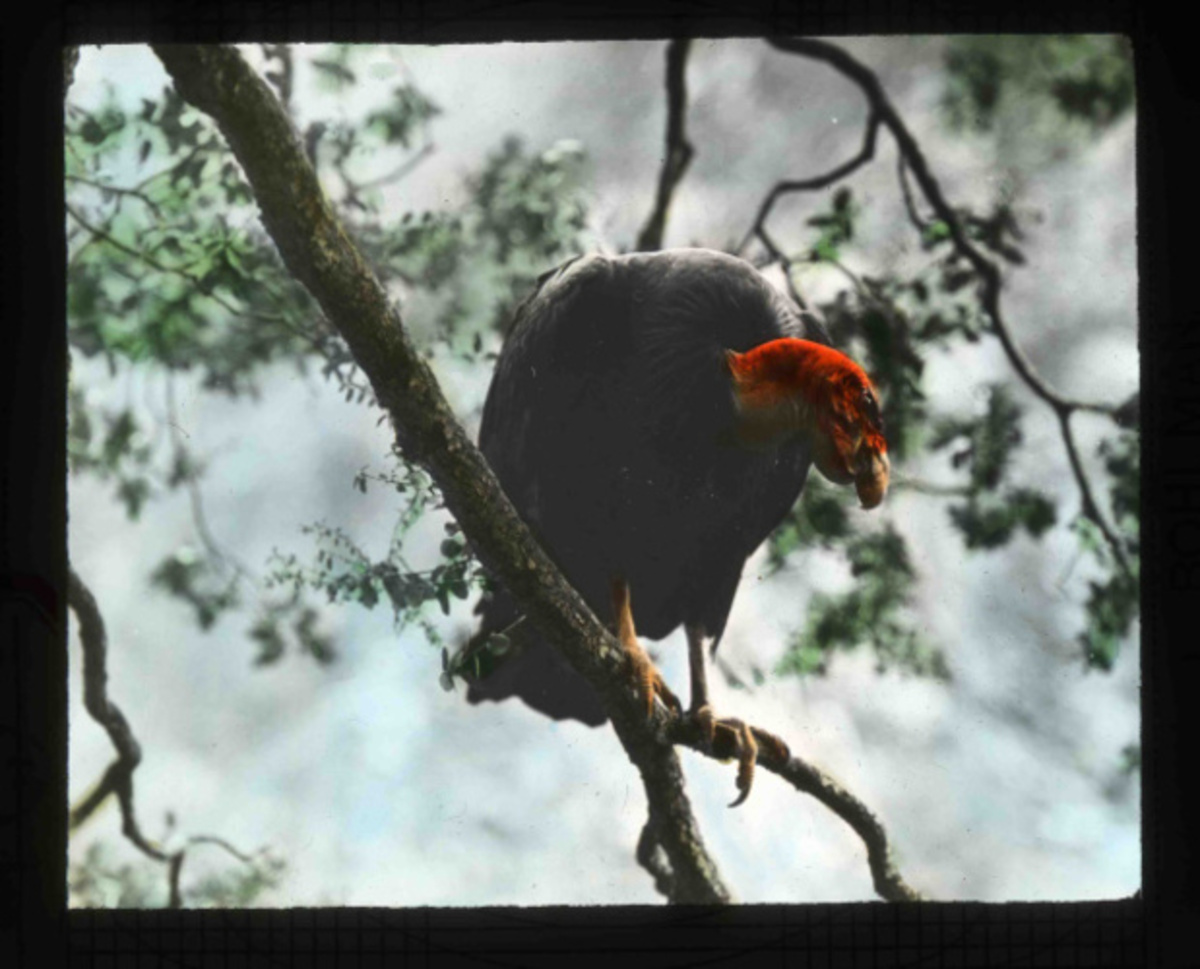 Male California condor (Gymnogyps californianus) perching in tree near Los Angeles nest site. Part of Finley and Bohlman's 1906 series of hand painted glass slides of condors.