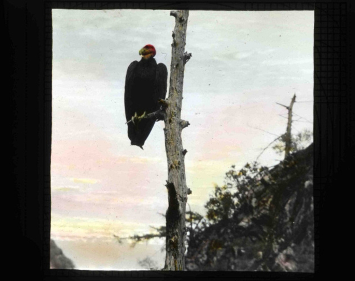 A California condor (Gymnogyps californianus) perching in one of its favorite old pines just above the nest site near Los Angeles. Part of the Finley and Bohlman collection scanned from glass slides made in 1906, provided courtesy of the Bird Alliance of Oregon.