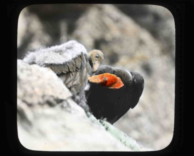 An adult California condor (Gymnogyps californianus) (right) with its young (left) at nest site near Los Angeles. Part of the Finley and Bohlman collection scanned from glass slides made in 1906, provided courtesy of the Bird Alliance of Oregon.