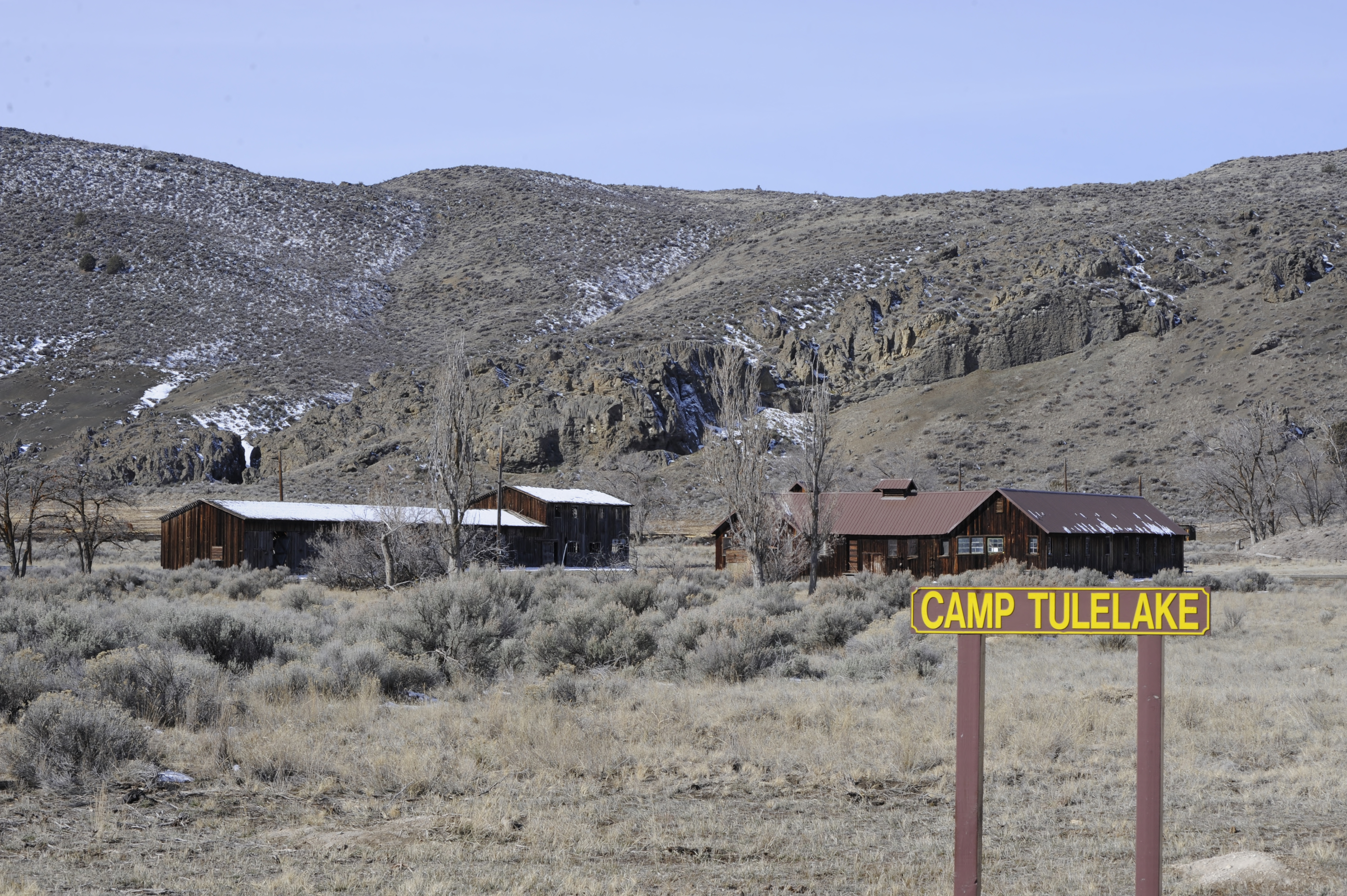 A sign indicates Camp Tule Lake on the Tule Lake National Wildlife Refuge. The camp is a historic Japanese-American Internment Camp.