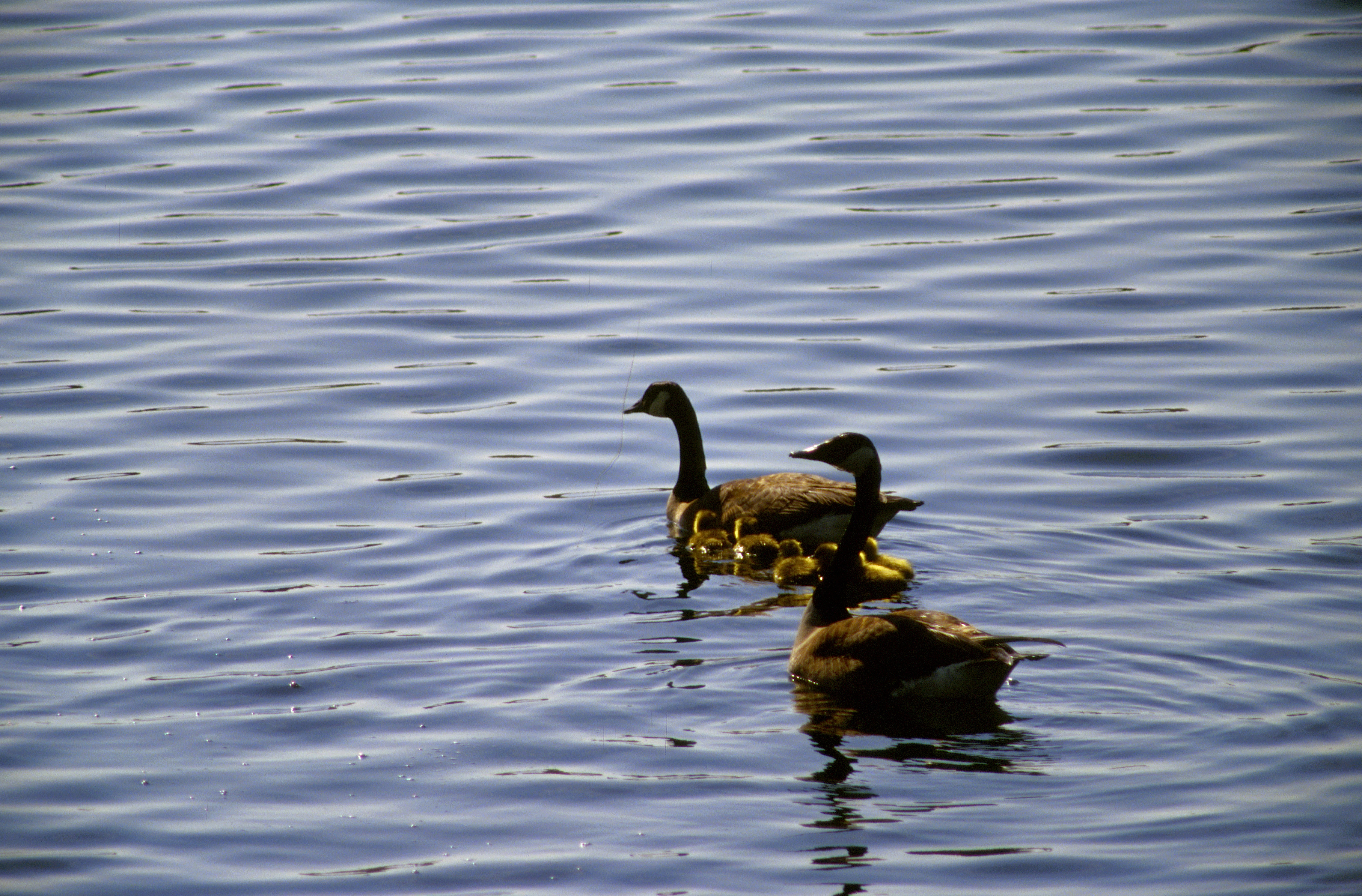 A profile view of pair of Canada Geese and their young.
