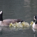 Seven fluffy yellow goslings swim alongside their Canada geese parents through a light snow storm on one of the hatchery ponds.