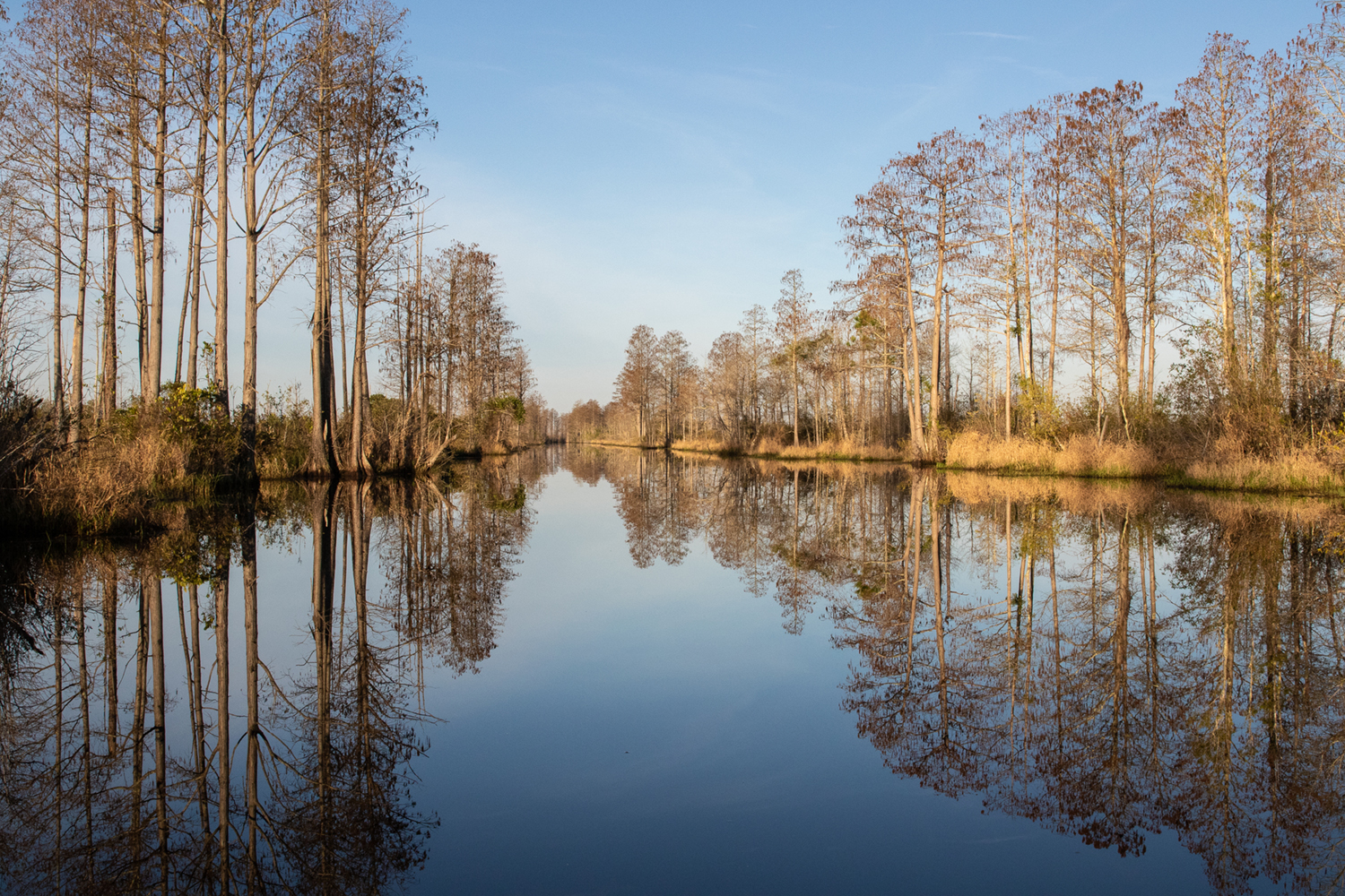 A canal’s smooth surface reflects the trees at Okefenokee Refuge.