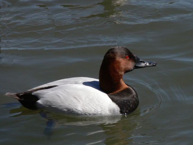 A canvasback taking a swim across the water.