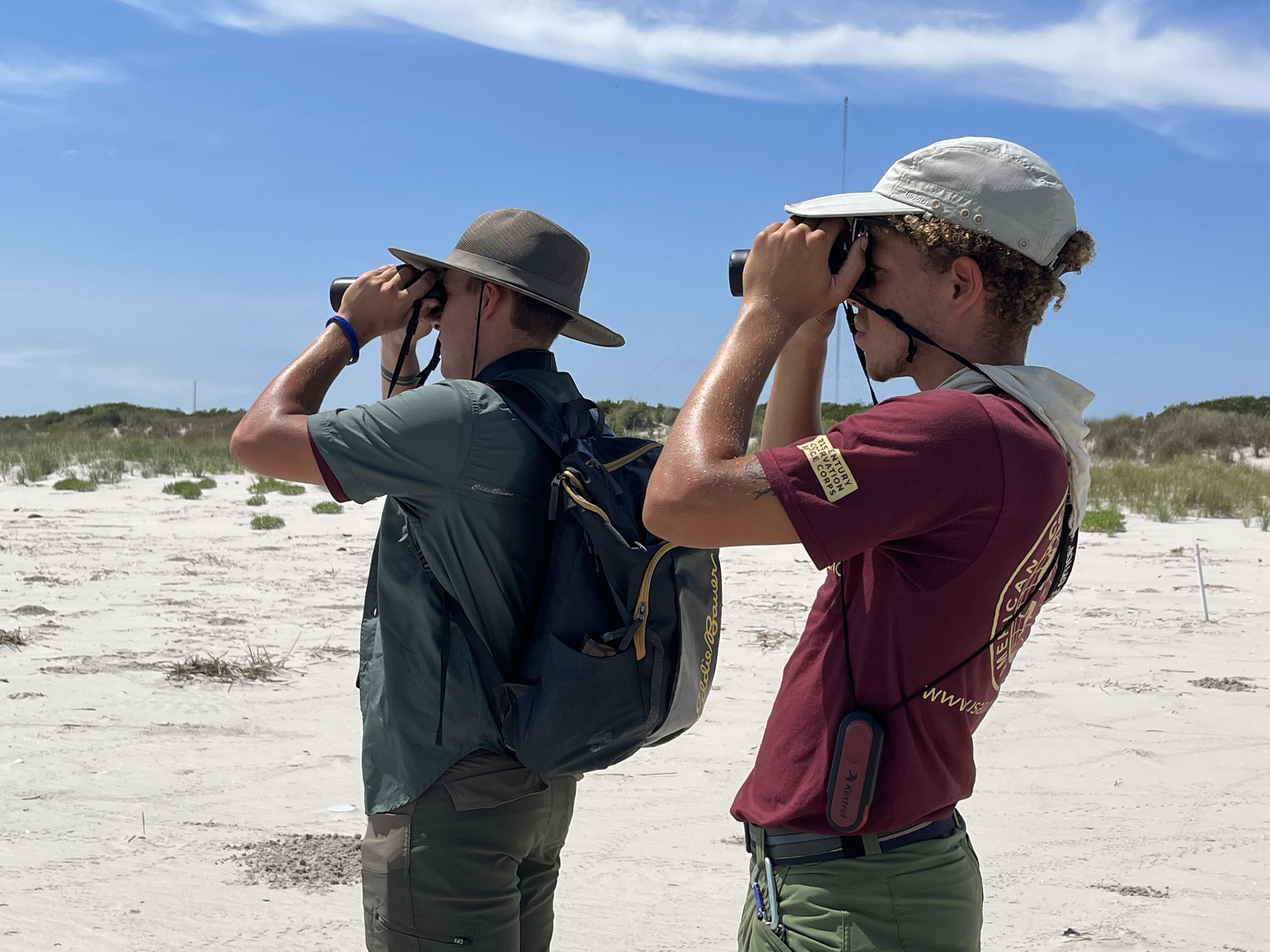 Summer interns at Cape May NWR using binoculars to observe shorebirds