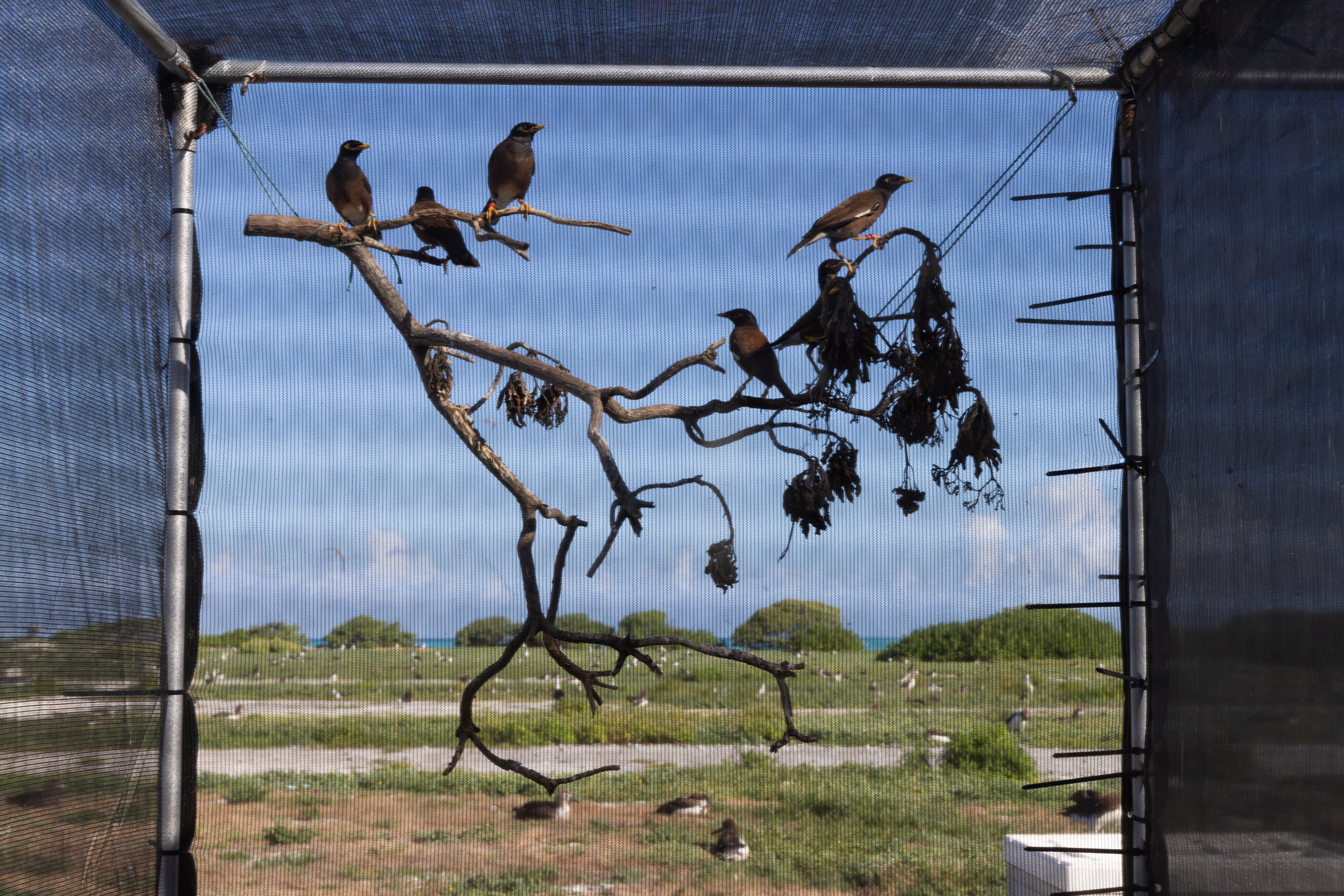 Captive common myna birds in an Eastern Island aviary on Midway Atoll National Wildlife Refuge during the Seabird Protection Project.
