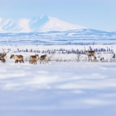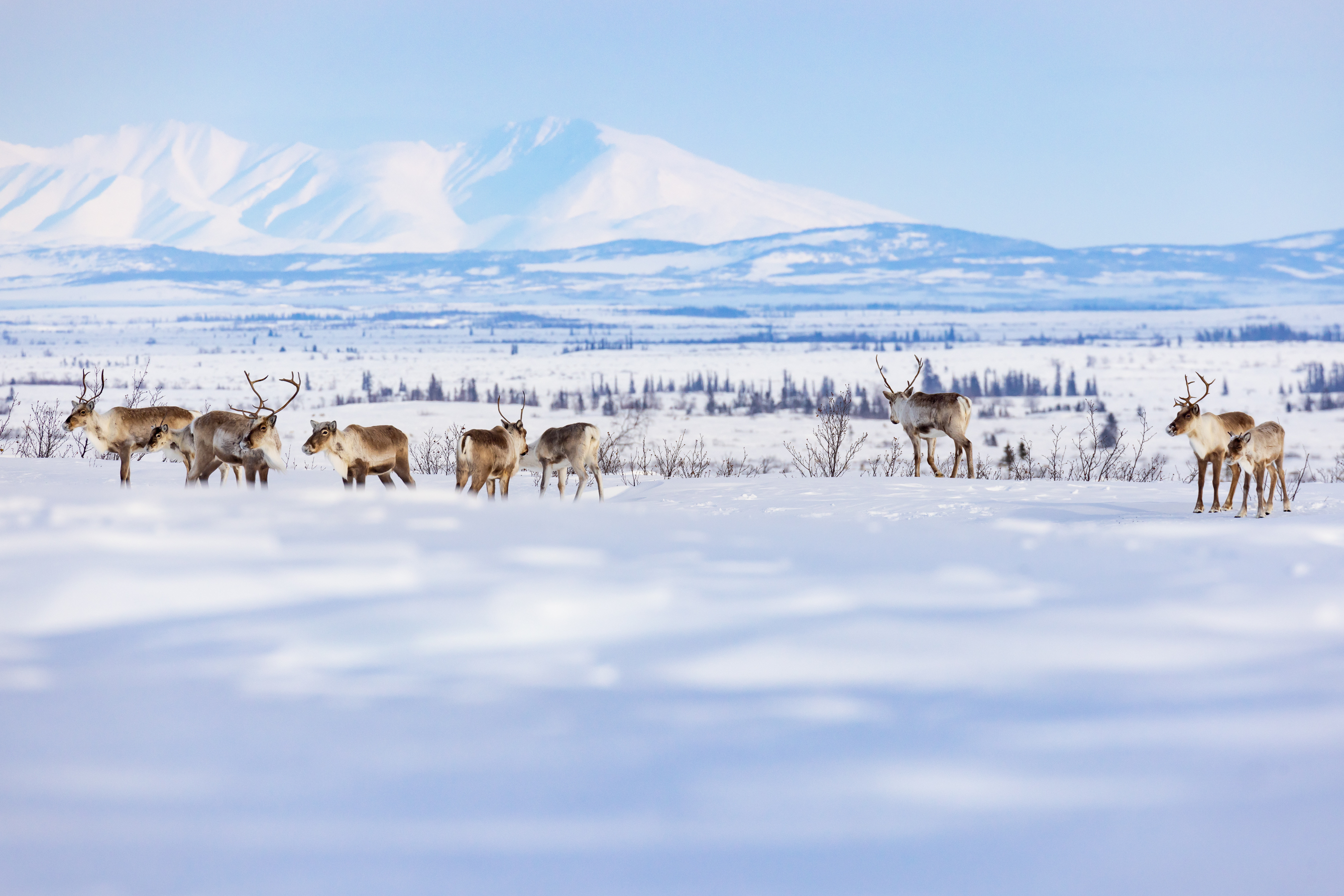 A group of tuttu (as caribou are called in the Iñupiaq language) from the Western Arctic caribou herd forage for lichen near a winter trail that crosses Selawik National Wildlife Refuge.