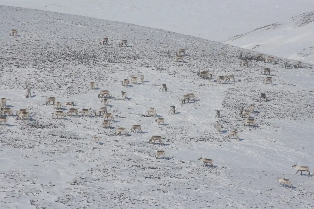Caribou foraging for lichens in the snow by Kyle Joly NPS