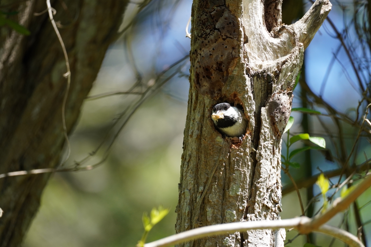 Carolina chickadees often excavate their own nests in the spring to raise their young in protected tree hollows.
