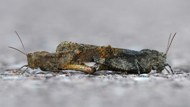 The Carolina Locust is a type of Short-horned Grasshopper and can be identified by its short antennae. A rough-looking exterior is greenish-brown with speckles of dark along its wings.