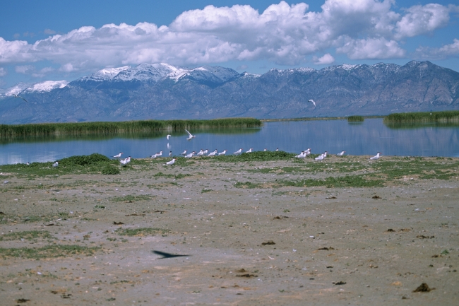 A group of Caspian Terns by the waterside in Bear River Migratory Bird Refuge located in Utah.