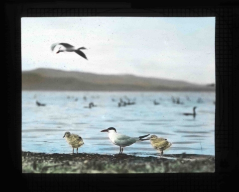 Hand painted glass slide of Caspian Tern's, young and old, at Klamath Marsh. Taken by Finley and Bohlman during a 1905 photography trip to the area.