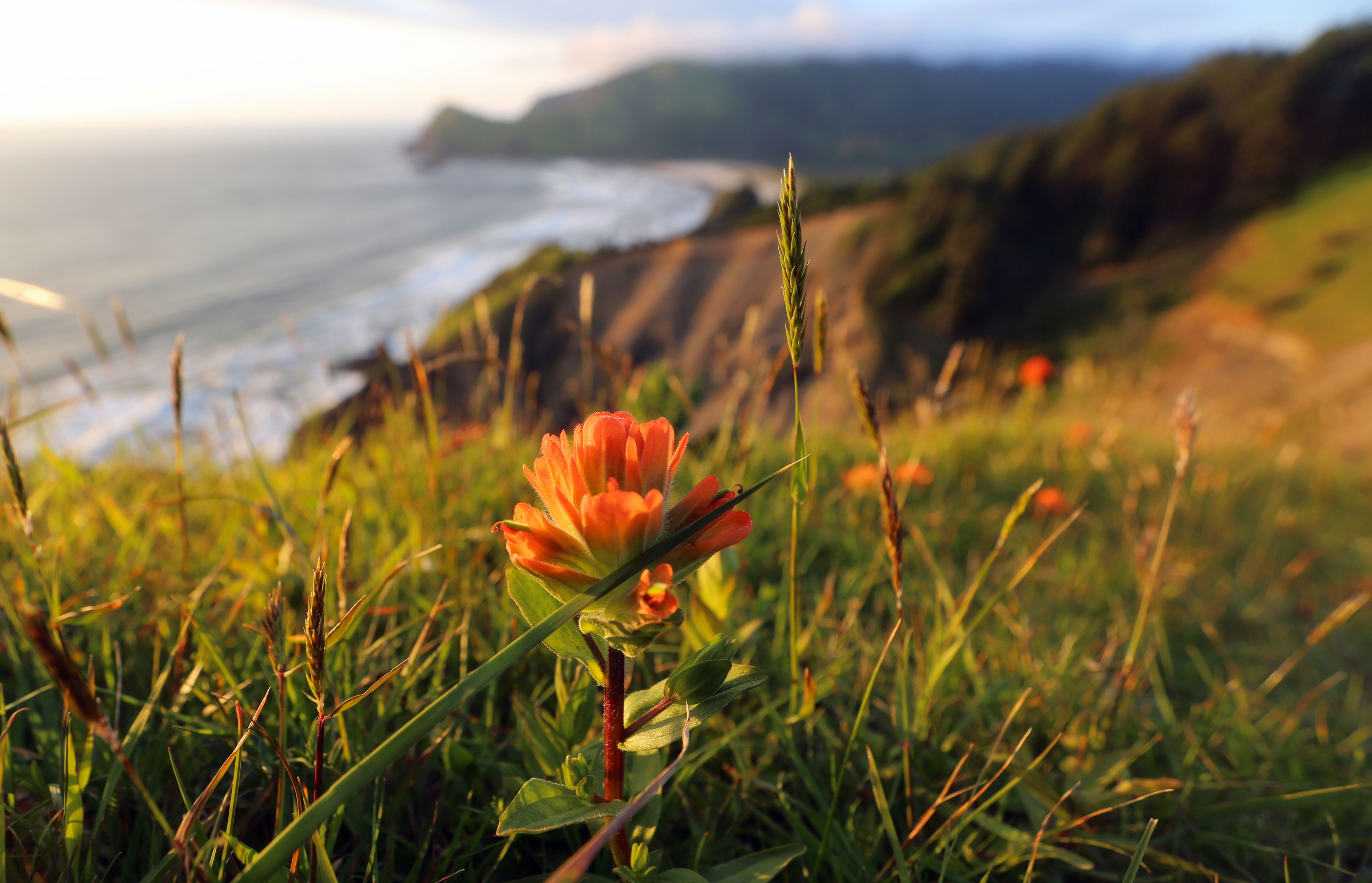 Indian Paintbrush in the foreground - Castilleja sp - with rocky coast in the background.