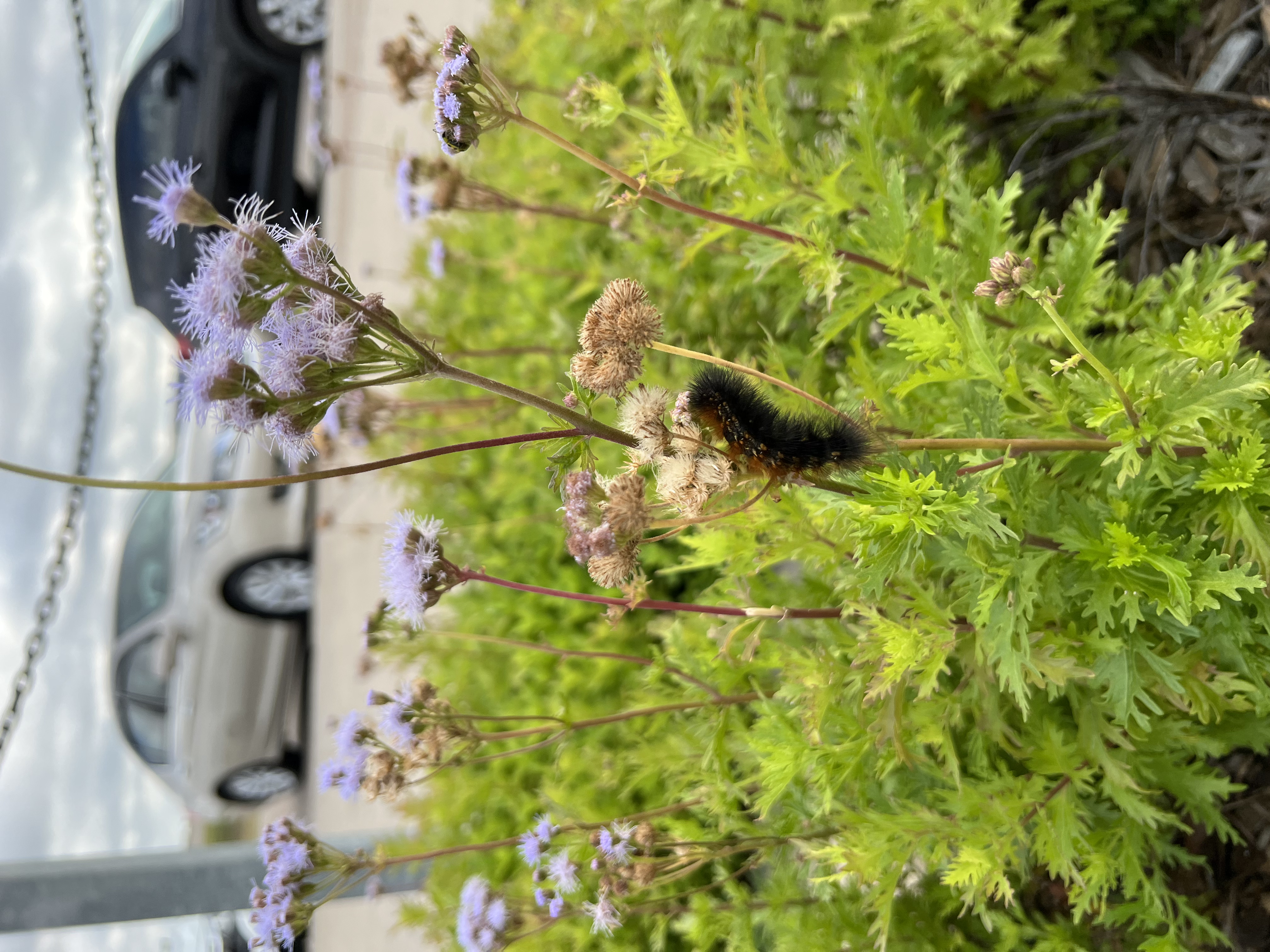 A caterpillar on a flower at an I-25 highway rest area "monarch waystation" in Texas by Kim Conrow, NPSOT.