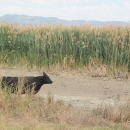 Black angus cow standing in a patch of phragmites that has been grazed and in front of phragmites patch that is not yet grazed on the Bear River Migratory Bird Refuge.