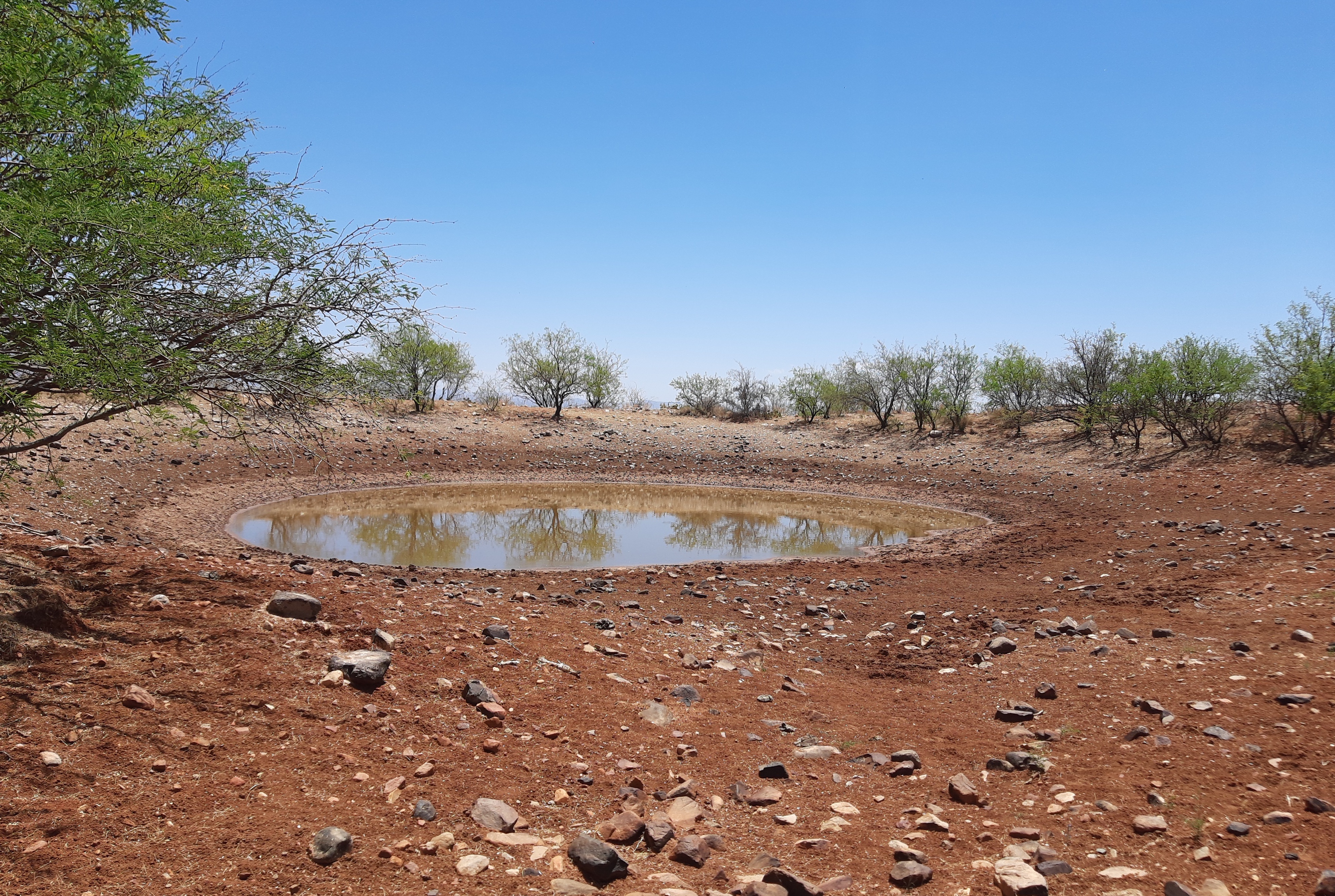 Earthen cattle tank running low on water at Pima County ranch during drought in early May 2021.