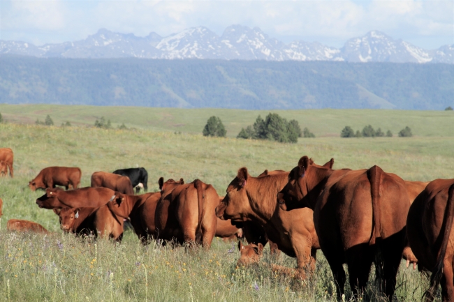 Cattle grazing on the Zumwalt Prairie Preserve with mountains in the background.