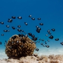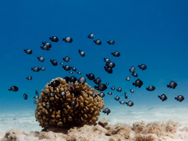 This small colony of cauliflower coral (Pocillopora meandrina), located in the French Frigate Shoals, part of the part of the Hawaiian Islands National Wildlife Refuge and the Papahanaumokuakea Marine National Monument, hosts more than a hundred endemic Hawaiian Domino Damselfish (Dascyllus albisella, ‘alo’ilo’i). Hawaiian domino damsels prefer corals situated in open sand and along the edges of coral reefs to ensure priority access to their planktonic meals.
