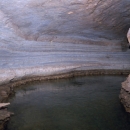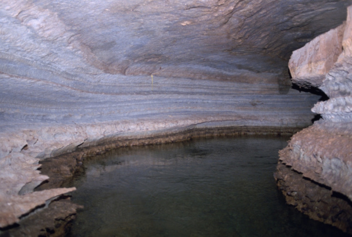 Cave interior; waterway with arched ceiling and flowing water in channel. Date of original is in the 1990's