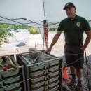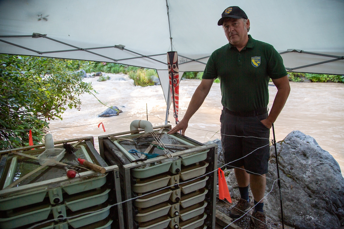 Matt Johnson, senior environmental scientist for the California Department of Fish and Wildlife (CDFW), explains the incubation system on the McCloud River where winter-run Chinook salmon eggs are held while they mature before being released into the river. This system combines components of a remote-site incubator with a system of trays from CDFW’s Mount Shasta Fish Hatchery to ensure mud from the river won't suffocate the eggs.