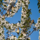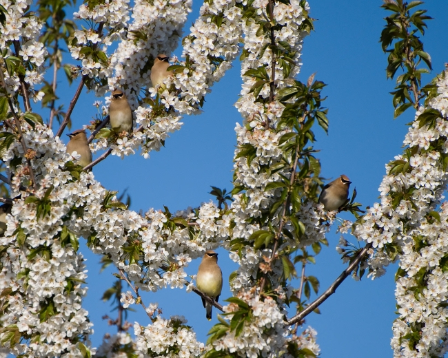 Brilliant display of cedar waxwings perched on flowering branches during a clear, Spring day.