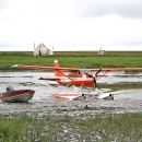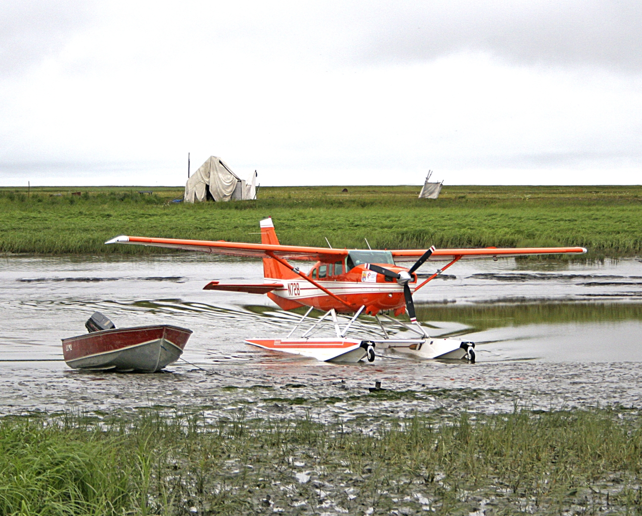 Cessna floatplane (amphibs) parked at the Old Chevak field site on the Yukon Delta National Wildlife Refuge; aircraft used by the Division of Migratory Bird Management for waterfowl monitoring and research.