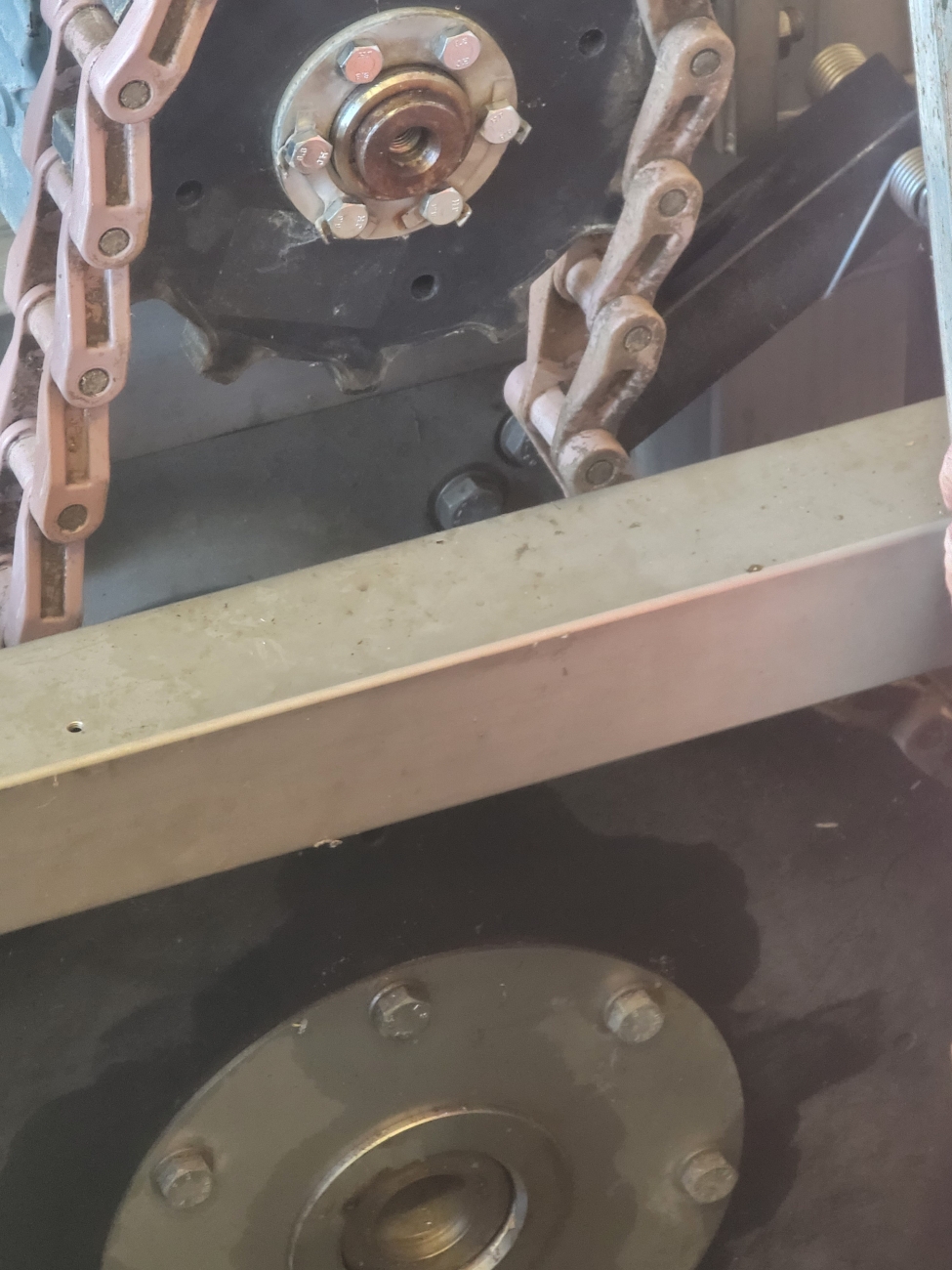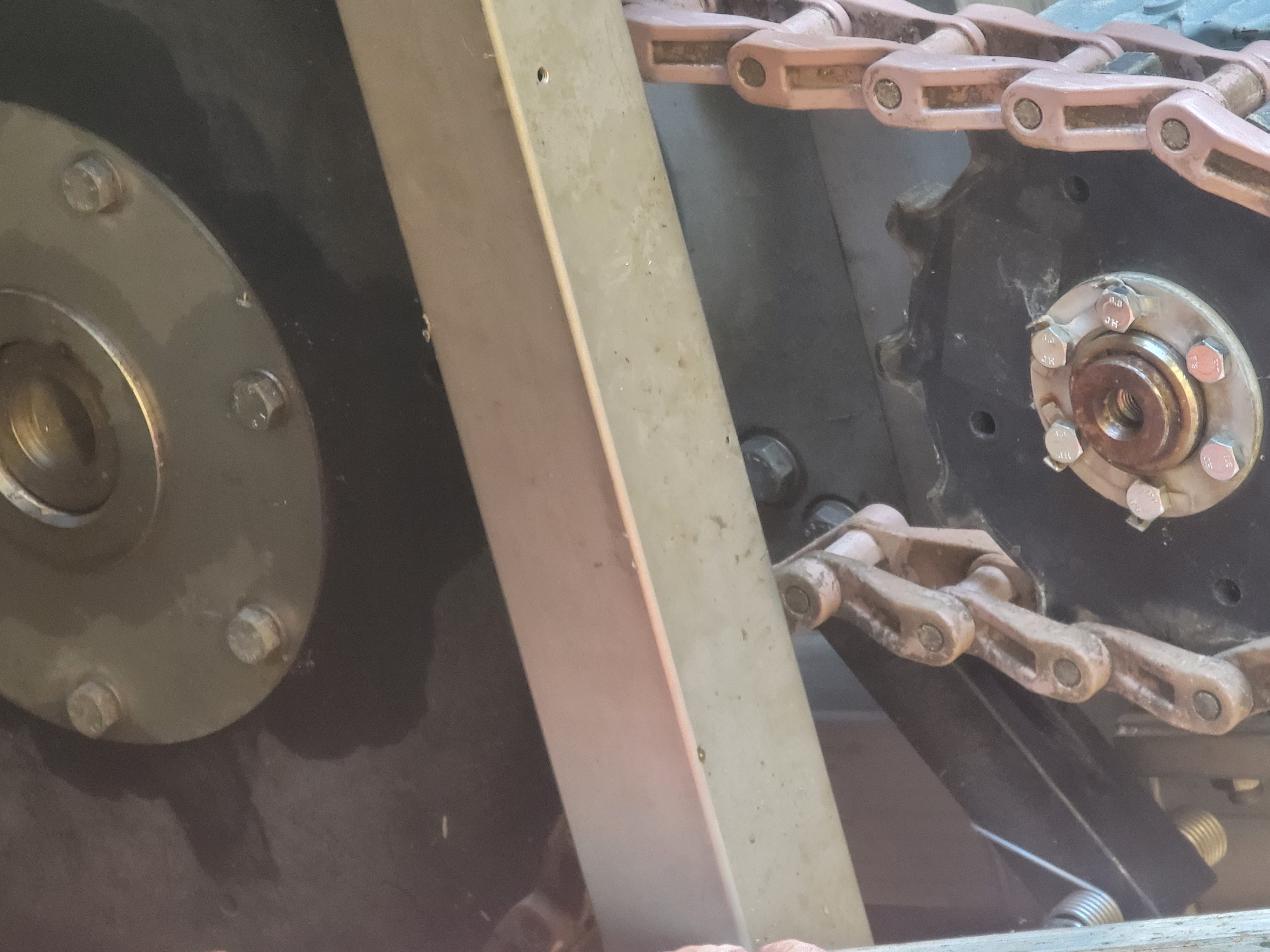 Drive and receiver sprocket gears with replaced bolts, chain and tensioner attached