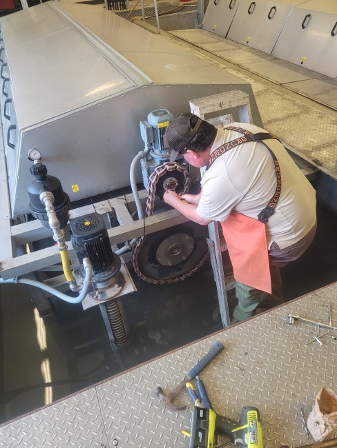 Installing chain after checking alignment and replacing sheared chain gear drive sprocket bolts
